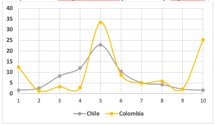 Chile es un país de centro. Más centrista que Colombia. Aún cuando la curva ideológica tanto en Colombia como en Chile se aproximan a un comportamiento normal, con posiciones de centro ideológico claramente mayoritarias, las posturas extremistas de Chile son menores y muy poca gente se autoidentifica como de “extrema derecha” o “extrema izquierda”.