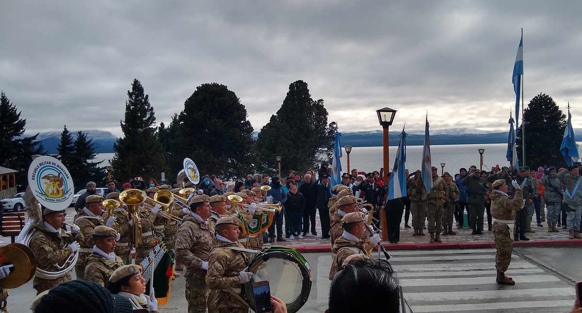 Gennuso encabezó el acto oficial en el Centro Cívico en una fría mañana, con temperaturas bajo cero, junto a funcionarios municipales, la senadora Silvina García Larraburu, la legisladora María Eugenia Martini, la banda de la escuela Militar de Montaña, abanderados de escuelas de la ciudad, grupos de danza y el ballet Tolkeyén.