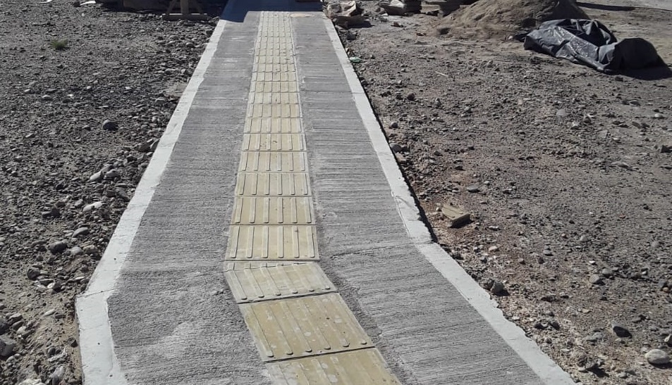 Ya se ejecutaron un total de 1.500 metros lineales de senda peatonal de hormigón, con rampas de acceso, comenzándose a colocar las baldosas podotáctiles en la franja central. Ya está concluido un 90% del proyecto.