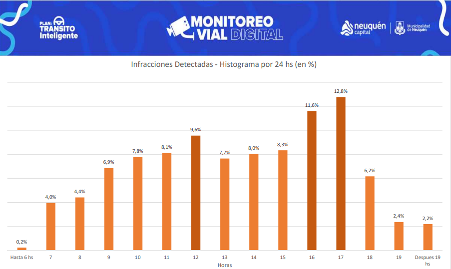 En el gráfico se puede ver que el 25% de las infracciones son registradas a las 16 y 17 horas. «Es un horario de mucha congestión en distintos puntos», remarcó Labrin.