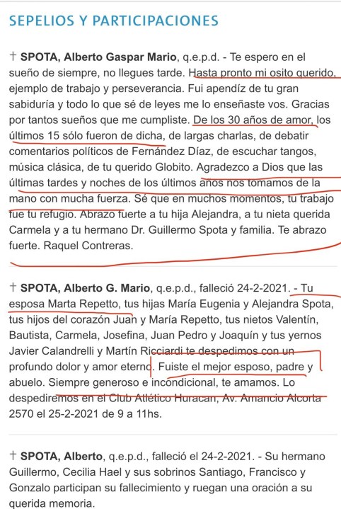 El segundo, efectivamente, fue de la esposa de Spota, Marta. «Te despedimos con un profundo dolor y amor eterno. Fuiste el mejor esposo, padre y abuelo. Siempre generoso e incondicional, te amamos”, escribió la mujer.