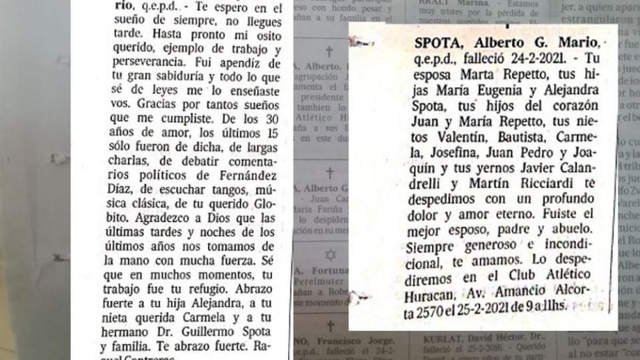 La insólita historia quedó plasmada en la sección de necrológicas del diario La Nación, donde la esposa y la amante de Mario Spota dejaron sus condolencias. Sus allegados están desconcertados.