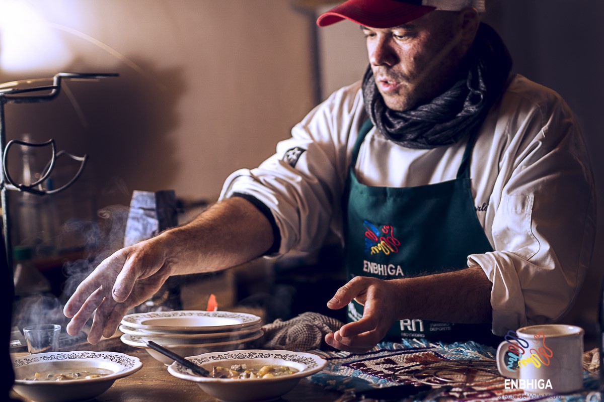 Carlo Puricelli, chef de Cipolletti, concentrado en servir su comida recién hecha, en el refugio El Puntudo, en plena meseta de Somoncurá, en el evento de tres días que organizó Enbhiga en esta parte de Río Negro. Fotos: Carlos Snaimon y Ramiro Ojeda.
