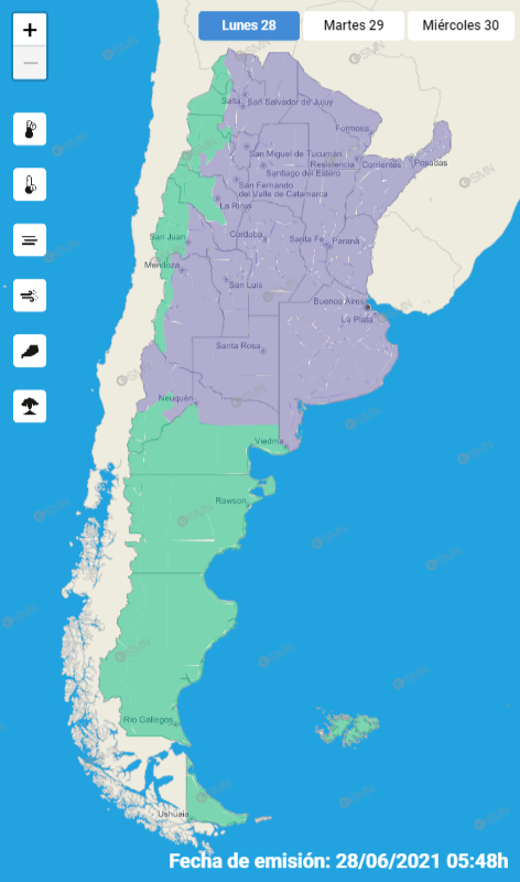 El Servicio Meteorológico Nacional (SMN) incluyó a parte de las provincias de Neuquén y Río Negro dentro de la «advertencia violeta» por las bajas temperaturas. En ambos casos se trata de la zona norte y se espera que para mañana mejoren las condiciones climáticas.