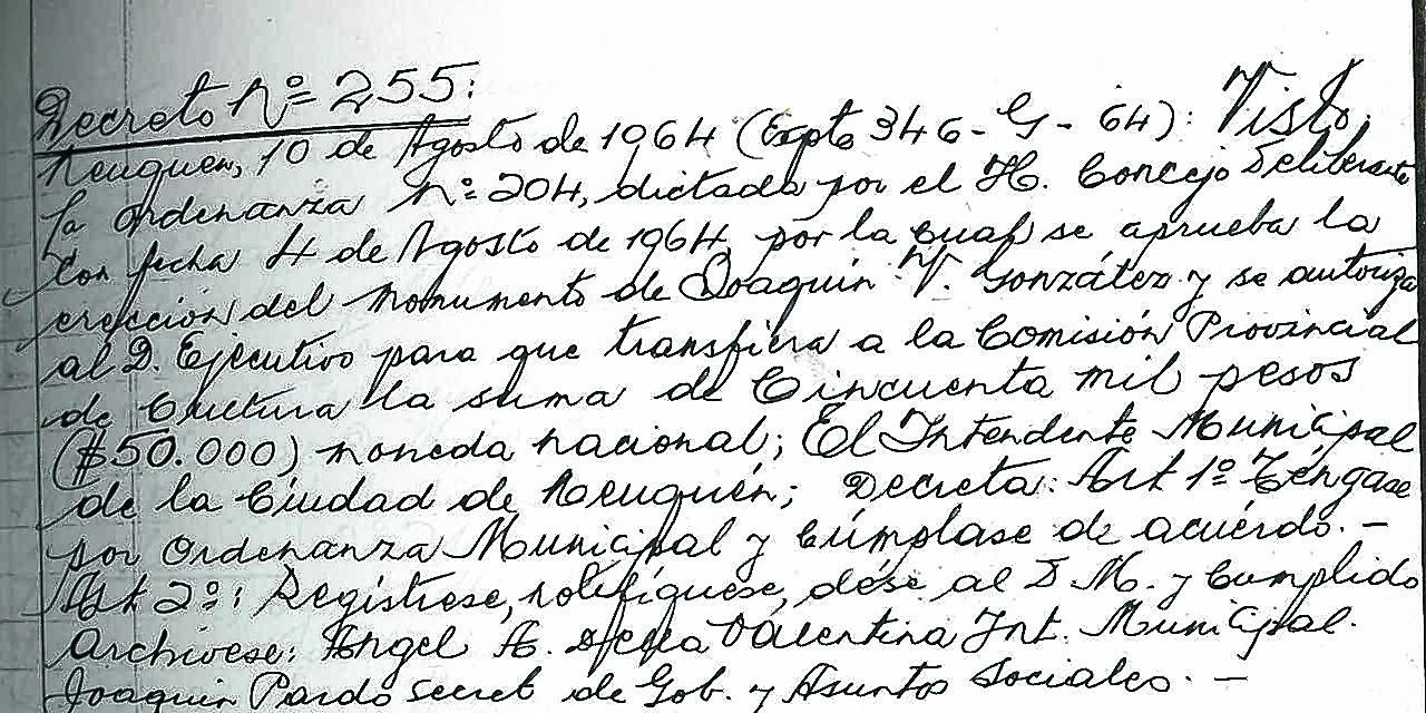La norma autorizó al Poder Ejecutivo para que transfiera a la dirección de Cultura una partida de 50.000 pesos moneda nacional para solventar los gastos que demande la obra de esculpir el monumento y la construcción de su basamento.