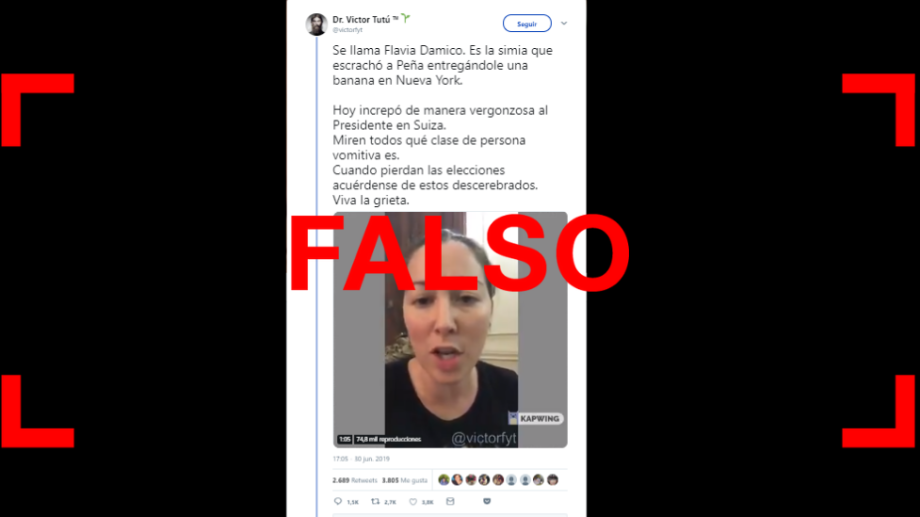 En redes sociales circuló que la mujer fue una de las que insultó al Presidente en Zúrich. En realidad quien se ve en el video fue otra persona llamada Paula Goitia. Damico sí interceptó a Marcos Peña en junio de 2018 en Nueva York para quejarse por las políticas del gobierno.