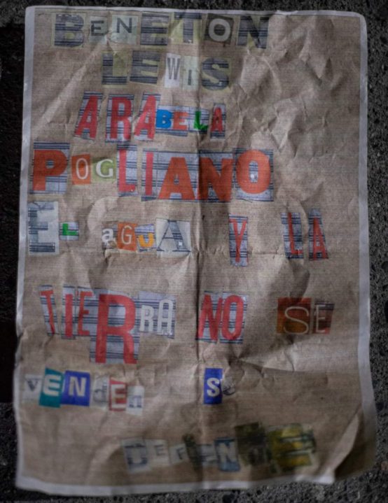 «Benetton, Lewis, Arabela, Pogliano. El agua y la tierra no se venden, se defienden», se lee en el panfleto confeccionado con letras recortadas de diarios y revistas, como en las películas.