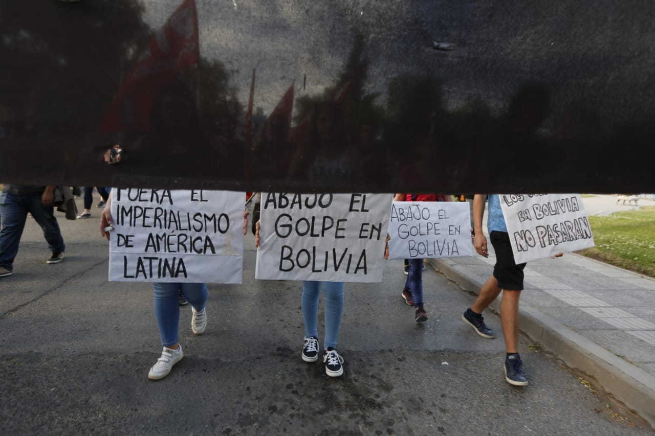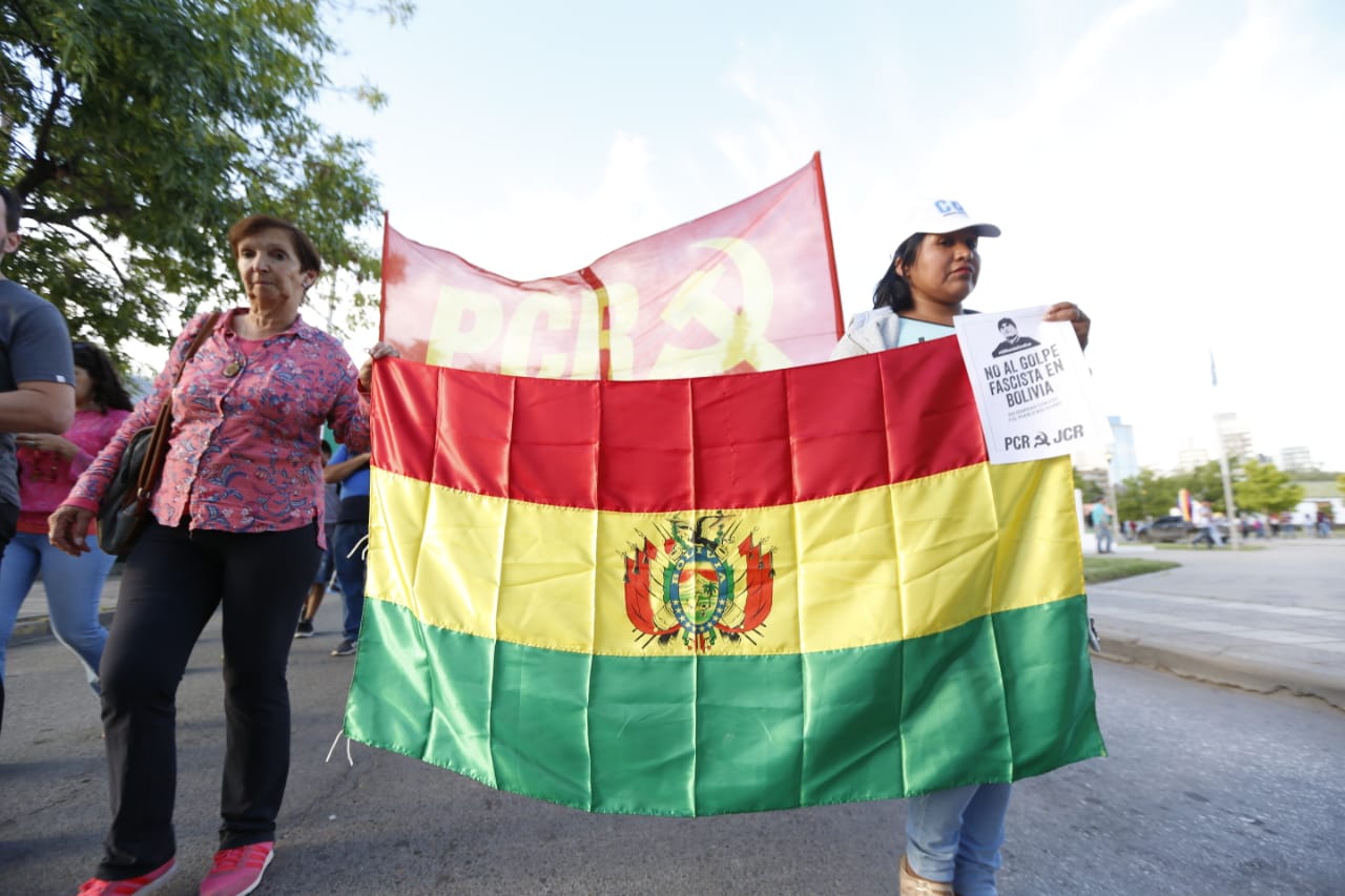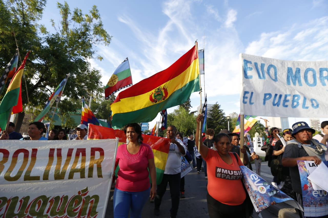 Representantes de la comunidad boliviana encabezan la movilización por el centro de la capital provincial. "No al golpe" y "fuerza Evo" son parte de las consignas.