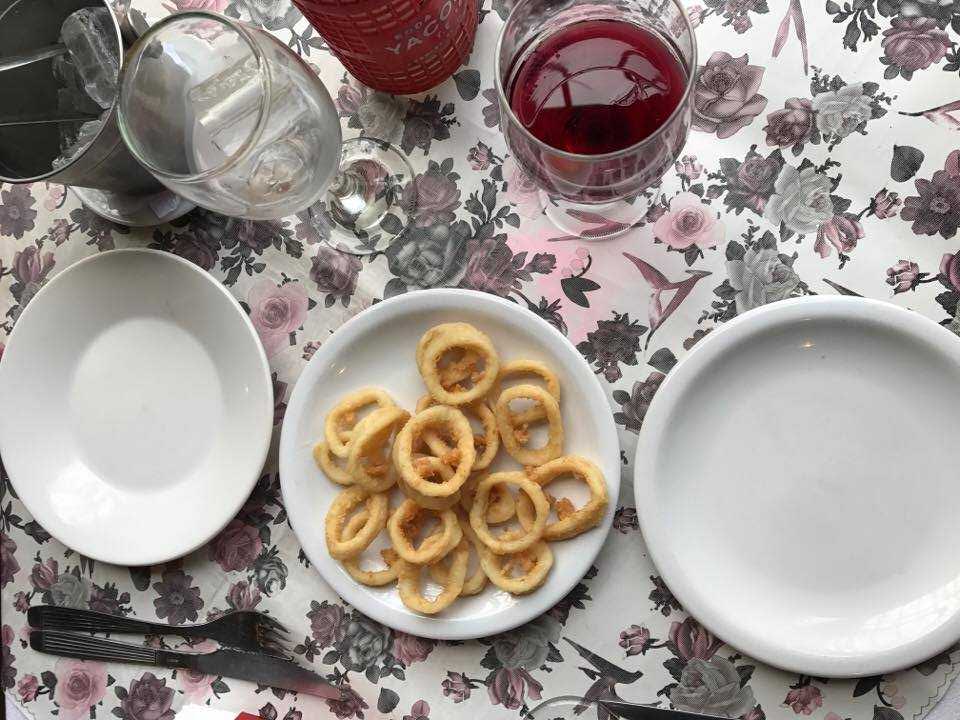 Natalia, la supermoza de memoria inquietante y que atraviesa el salón como una flecha me dice: “metimos rabas esta semana” y ahí nomás como en giro de bailarina de ballet cambiamos la empanada de carne que iba a salir de entrada por una porción de anillos de calamar rebozados. Limón y vino con burbujas.