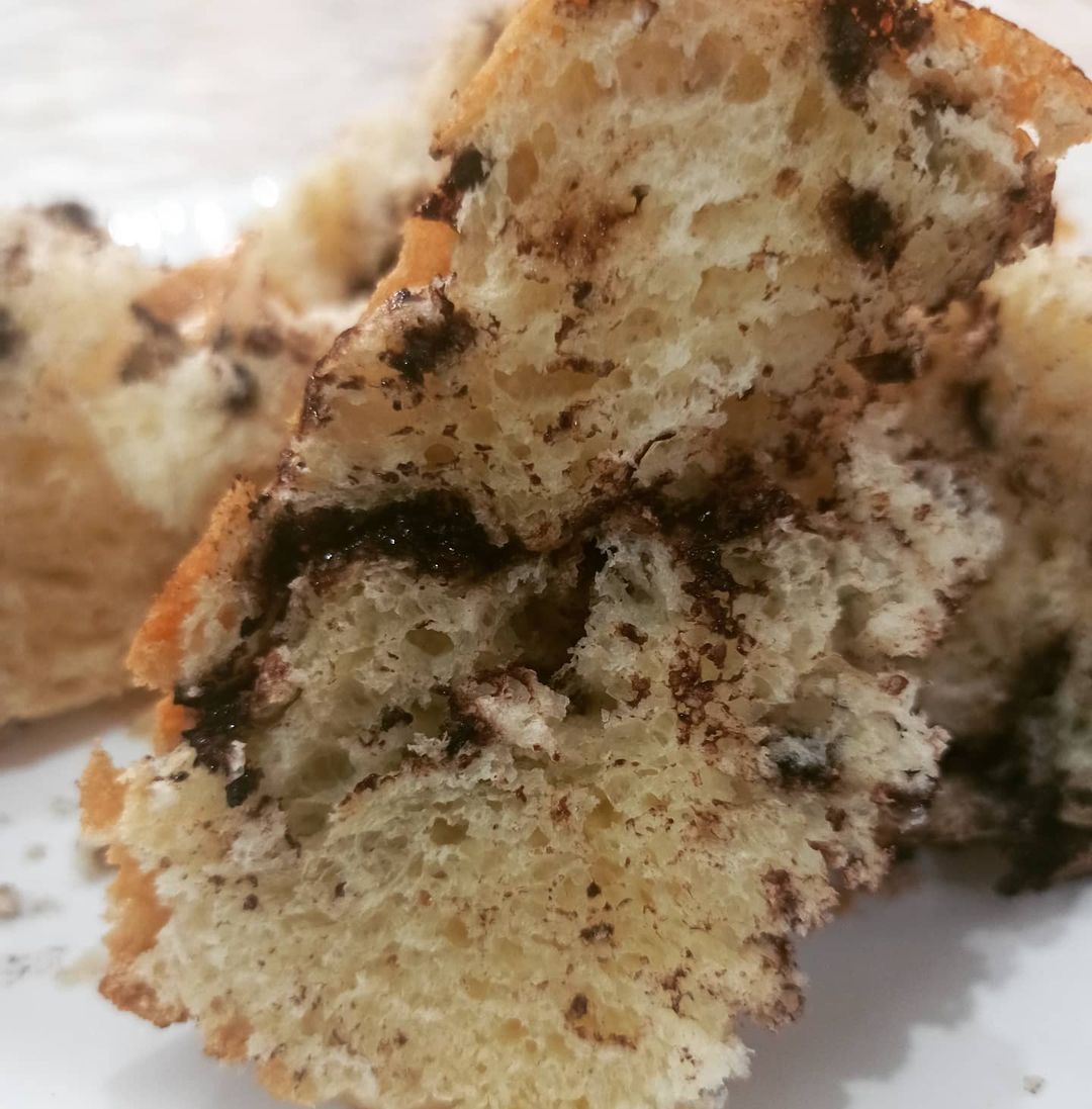 Retirar del bol la masa y desgasificar en la mesada, estirar y agregar lo que van a poner adentro (yo en este caso puse chips de chocolate, pero puede ser lo que quieran). Enrrollan la masa, de está manera van a quedar bien repartidos los chips por toda la masa. Si se les pega a la mesada ayúdense con un cornet o espátula, traten de no agregar harina.
