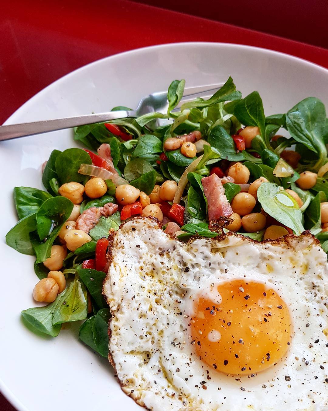 Una ensalada templada de berros, garbanzos, morrones, panceta y cebolla. Acompañado de un huevo a la plancha.