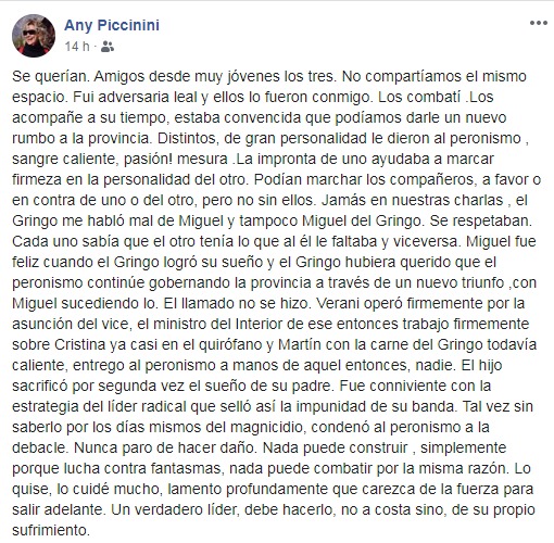 Después, se focaliza en el papel del ex intendente y hoy diputado, afirmando que “Martín, con la carne del Gringo todavía caliente, entrego al peronismo a manos de aquel entonces, nadie. El hijo sacrificó por segunda vez el sueño de su padre. Fue conniviente con la estrategia del líder radical que selló así la impunidad de su banda. Tal vez sin saberlo por los días mismos del magnicidio, condenó al peronismo a la debacle”.
