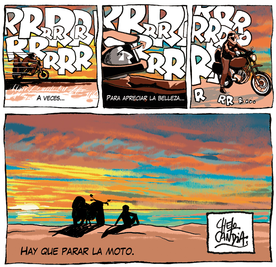 «Parar la moto», la tira 391 de Viajeros en el Voy