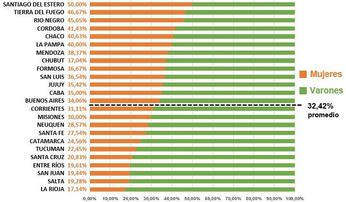 El estudio revela que en las legislaturas sólo 10 de los 24 distritos provinciales alcanzan el objetivo de cuotas o paridad de género que se proponen en las leyes provinciales. De las 32 cámaras legislativas, en 30 son más varones que mujeres y en 12 la presencia femenina está por debajo del 30%.