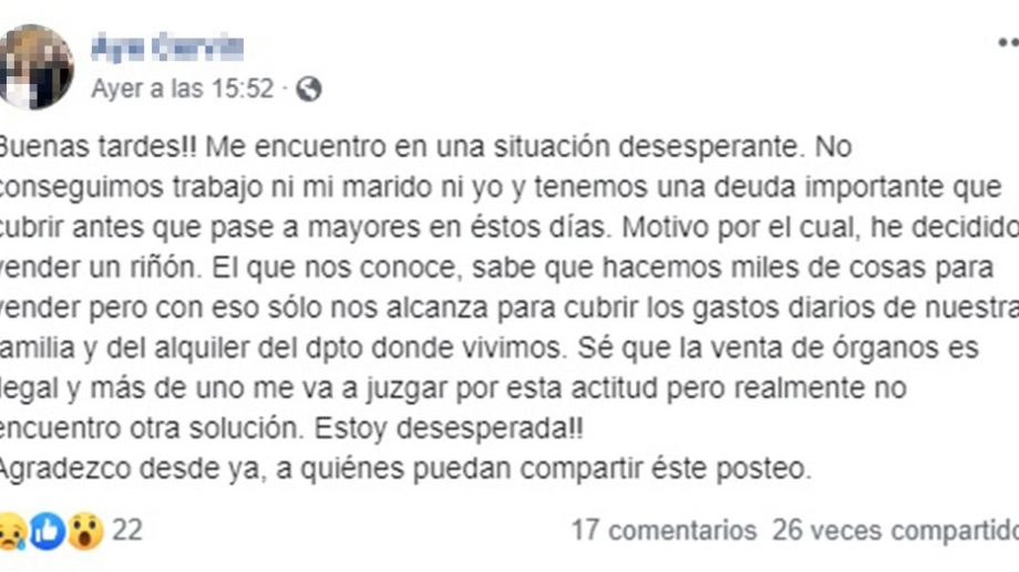 «Se me puso la piel de gallina que una persona quiera vender un órgano, lamento mucho la situación que está pasando, en Desarrollo tenemos muchos casos y a veces nos superan», expresó.