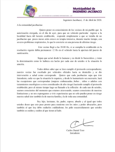 Por su lado, el intendente Toro fundamentó su decisión de autorizar el ingreso del vecino junto a su hijo al señalar que se trataba de un jacobacino que pocos meses atrás estuvo en terapia intensiva, durante mucho tiempo, con severos problemas respiratorios, lo que lo convierte en una persona de altísimo riesgo.