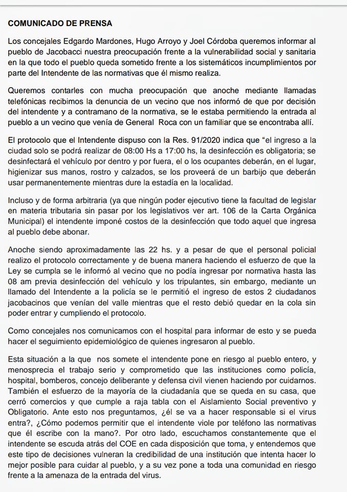 Los concejales Edgardo Mardones (JSRN) y Joel Córdoba y Hugo Arroyo (ambos del FdT) señalaron que la medida adoptada el intendente “pone en riego al pueblo y menosprecia el trabajo serio y comprometido que las instituciones como policía, hospital, bomberos voluntarios, Concejo Deliberante y Defensa Civil vienen haciendo por cuidarnos. También el esfuerzo de la mayoría de la ciudadanía que se queda en su casa, que cerró comercios y que cumple a raja tabla con el Aislamiento Social preventivo y Obligatorio”. Los vecinos también se hicieron sentir a través de las redes sociales.