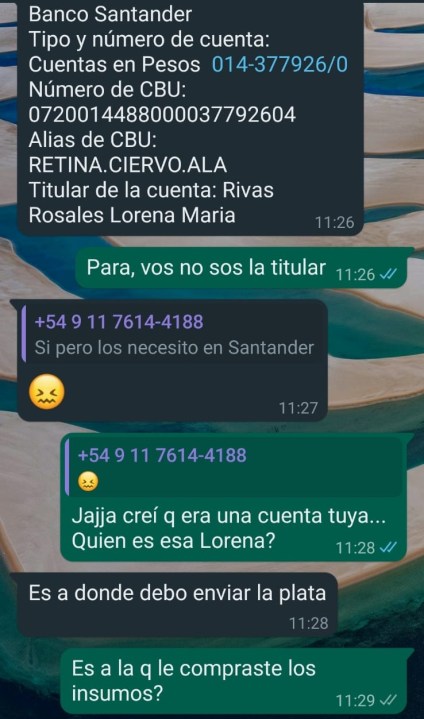 Entre ellas, la cuenta de otra persona que intentó estafar, sin éxito, a alguien que tomó sus datos para hacerlos públicos.