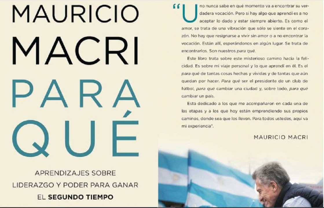 El nuevo libro de Mauricio Macri, «Para qué», aún no se encuentra en las librerías. Estará recién el próximo 18 de octubre. Sin embargo, la editorial que lo publica, Planeta, ha decidido liberar un anticipo del texto. No cualquiera, sino uno bien sugestivo, titulado Segundo tiempo. A continuación, el adelanto: