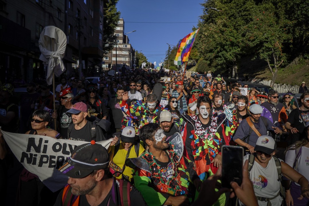 La percusión murguera tuvo fuerte protagonismo en la movilización, que convocó a decenas de parches y bailarines. La presencia de organizaciones de artistas fue muy notoria, con una colorida bandera del Frente Cultural Bariloche y otra de la Asamblea de Poetas.
