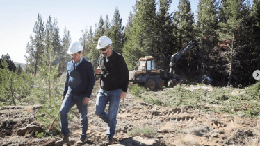 Lara estuvo recorriendo la plantación de Abra Ancha, uno de los campos de Corfone, junto al gobernador a cargo Marcos Koopmann a quien le demostraron cómo trabaja la máquina finlandeza que efectúa la poda de los pinos, y la industrialización que se hace una vez que se seca.