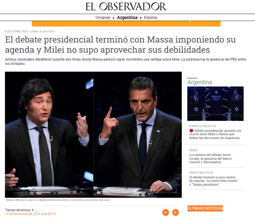 El Observador de Uruguay tituló: «El debate presidencial terminó con Massa imponiendo su agenda y Milei no supo aprovechar sus debilidades», resaltando la ventaja de Massa y la ausencia del PRO entre los invitados.