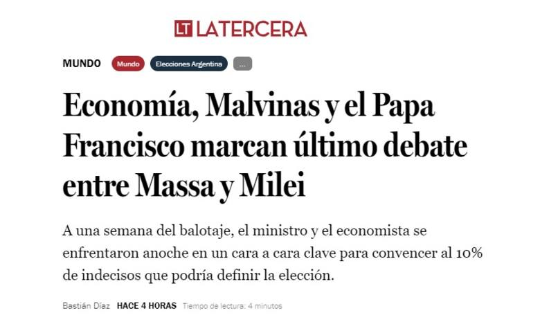 El diario La Tercera de Chile señaló que «Economía, Malvinas y el Papa Francisco marcan último debate entre Massa y Milei«, enfocándose en los temas clave que surgieron durante la noche.