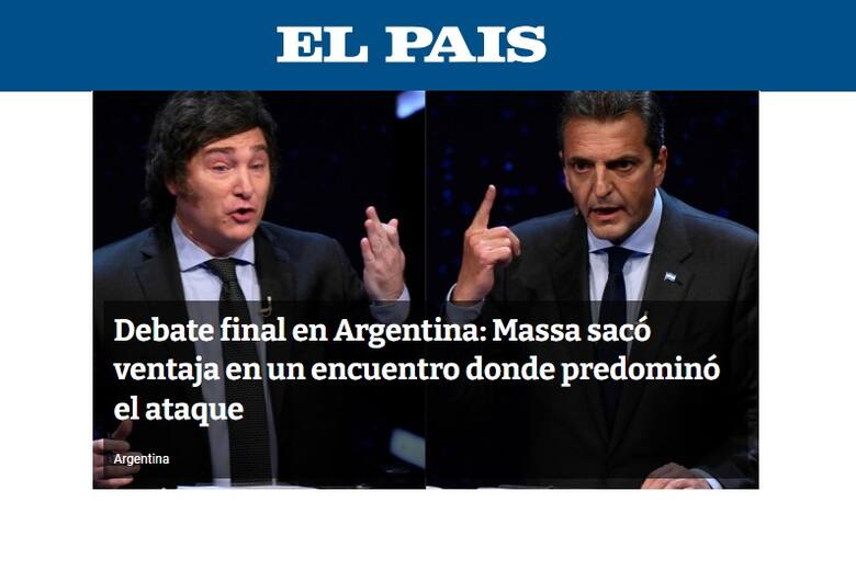 El diario El País de España tituló contundentemente: «Massa arrincona a un Milei apagado en el último debate presidencial en Argentina». Resaltaron el enfoque de Massa al exponer contradicciones y cuestionar la estabilidad emocional de Milei.