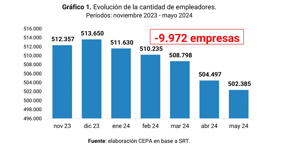 El análisis de la evolución de la cantidad de empleadores y trabajadores, muestra una disminución en el número de empleadores que declararon trabajadores, de 512.357 en noviembre de 2023 a 502.385 en mayo de 2024, lo que representa una pérdida de 9.972 empresas.