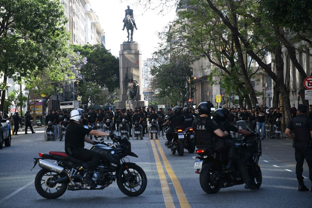 En pleno centro porteño distintas fuerzas de seguridad tienen acordonadas las calles para que los manifestantes no interrumpan el tránsito. Los manifestantes marchan en el marco del 22 aniversario del estallido social del 20 de diciembre de 2001.