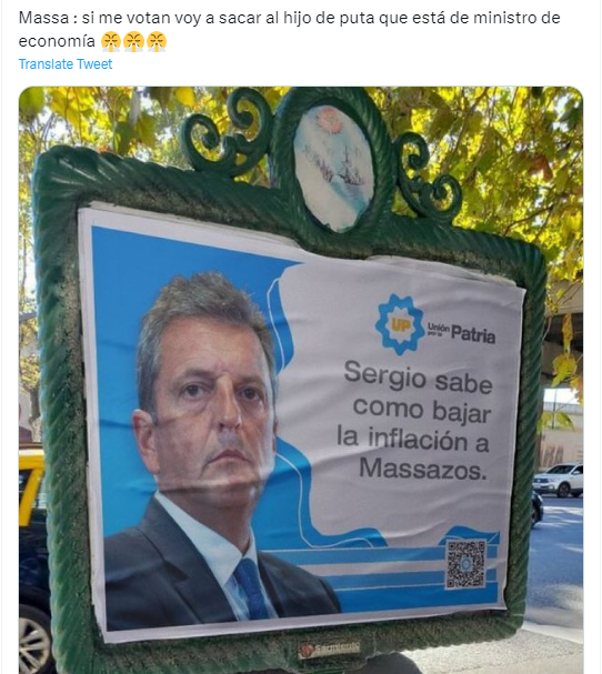 “Sergio sabe como bajar la inflación a Massazos”, dice un supuesto afiche de campaña del precandidato presidencial Sergio Massa, de la coalición oficialista Unión por la Patria y quien competirá en las elecciones primarias contra Juan Grabois. Pero la imagen, compartida por más de 5.000 usuarios en redes sociales desde el 25 de junio, tras anunciarse su postulación, es un montaje hecho sobre una foto que circula desde 2022.