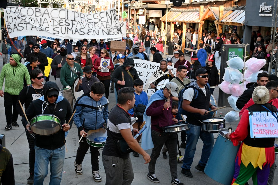 “Señora gobernadora no somos diez”, afirmaron algunos de los policías, cuando la columna de alrededor de 300 personas llegó a la plaza del Centro Cívico, al ritmo de los bombos y redoblantes ante la mirada sorprendida de turistas y residentes que paseaban por la calle Mitre y filmaban con sus celulares la particular manifestación. La protesta coincidió con la apertura de la Fiesta Nacional del Chocolate.