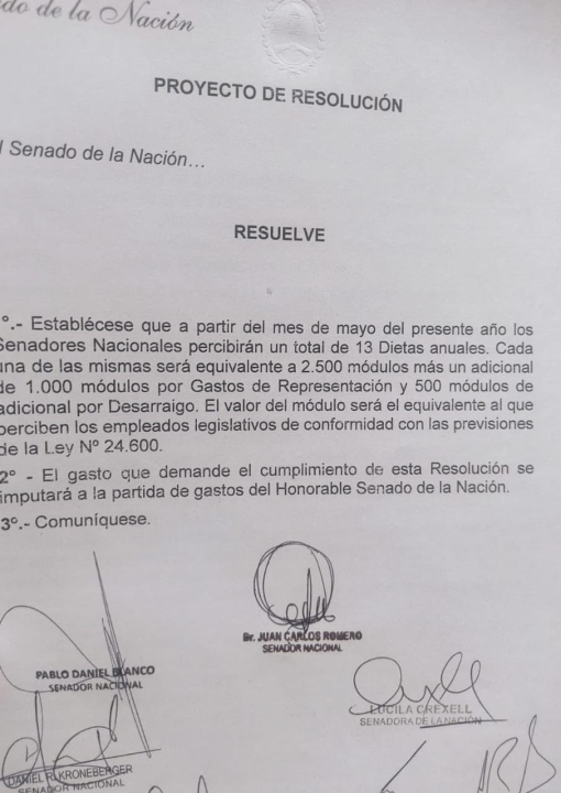 El cambio busca que los senadores cobren 13 dietas anuales, y no 12. Además que cada una sea equivalente a 2500 módulos (cada uno equivale a 1668 pesos) más un adicional de 1000 módulos por Gastos de Representación y 500 módulos adicional por Desarraigo.