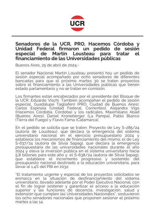 La Unión Cívica Radical (UCR), bajo la conducción de Martín Lousteau, tomó la iniciativa de convocar a una sesión especial en el Senado para abordar el tema del financiamiento a las universidades públicas. Esta decisión llega después de la masiva marcha que tuvo lugar el martes, donde miles de personas se congregaron en defensa de la educación superior. Además, surgió tras la caída de la sesión especial solicitada desde Unión por la Patria (UxP) por falta de quórum, en Diputados. Será el martes que viene.