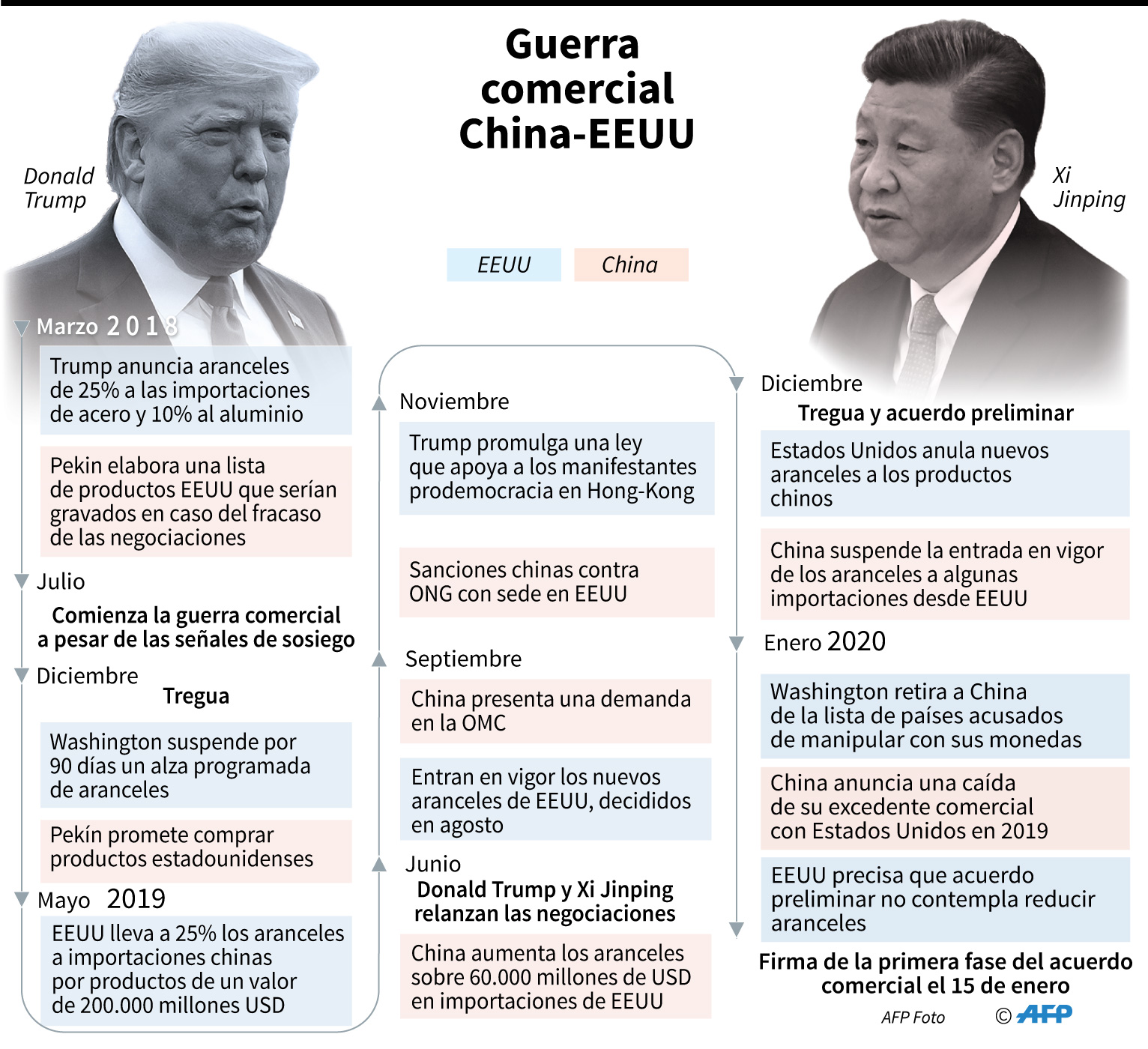 Tras casi dos años de conflicto, Estados Unidos y China, las mayores economías del mundo, firmaron un acuerdo "Fase 1'' en el que China se compromete a  comprarle a su rival en los próximos dos años 200.000 millones de dólares más que en 2017. También hubo avances en Agricultura, mercados de cambio, tecnología, patentes y resolución de conflictos.