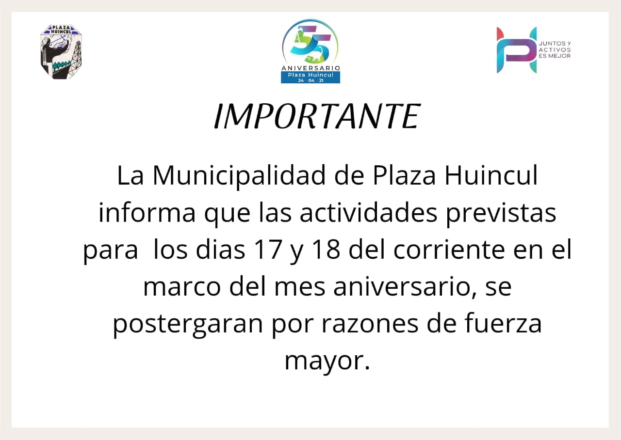 La Municipalidad de Plaza Huincul decidió suspender las actividad programadas para el aniversario entre el sábado y domingo por razones de fuerza mayor, lo que determinó la postergación del Rally de Plaza Huincul, con récord de participates para la segunda fecha del certamen neuquino.