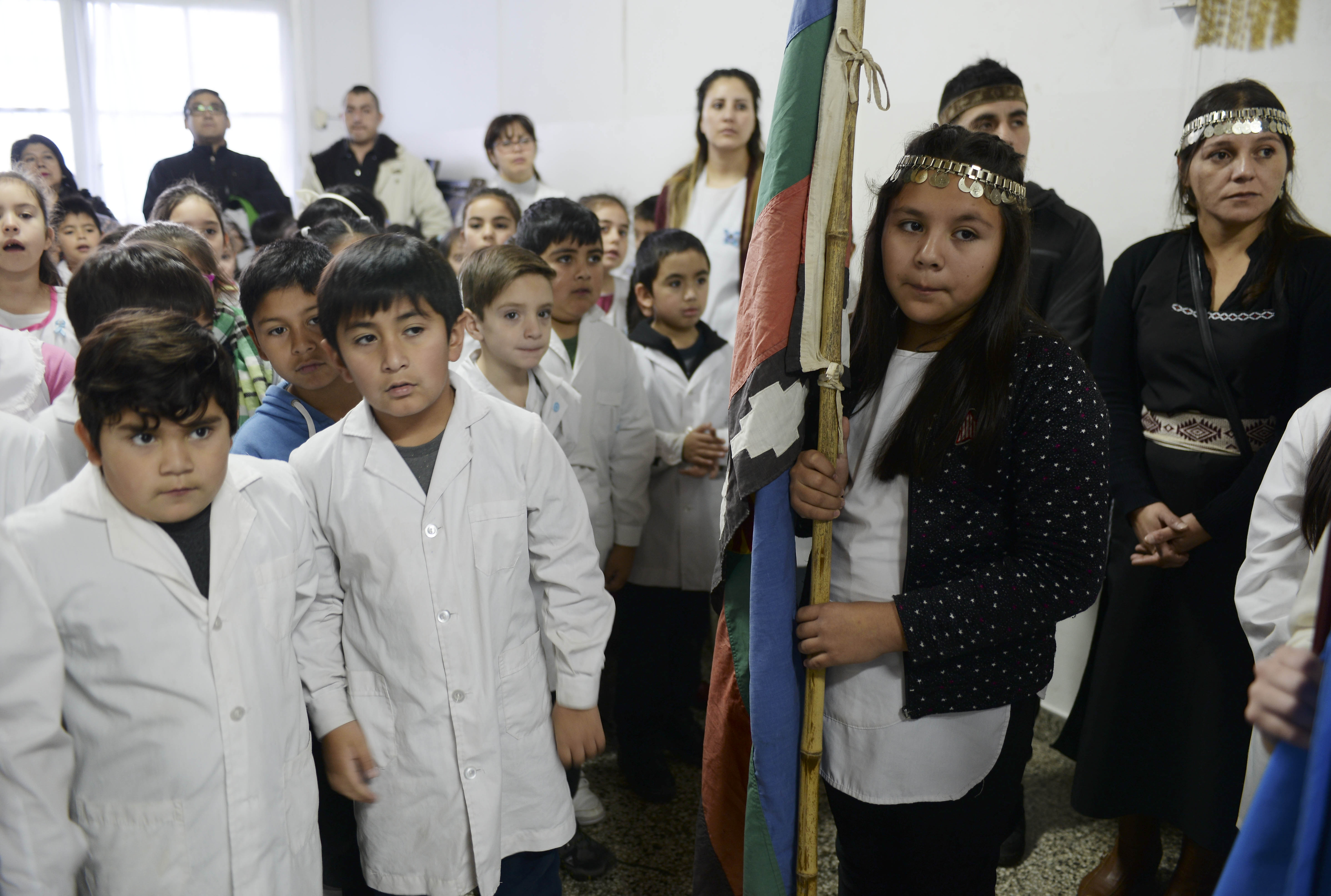Dos niños de la comunidad mapuche prometieron hoy lealtad a la bandera Argentina en la Escuela 266 y los acompañó, por primera vez en la institución, la bandera mapuche, Wenufoye, insignia de la cultura ancestral reconocida en Bariloche.