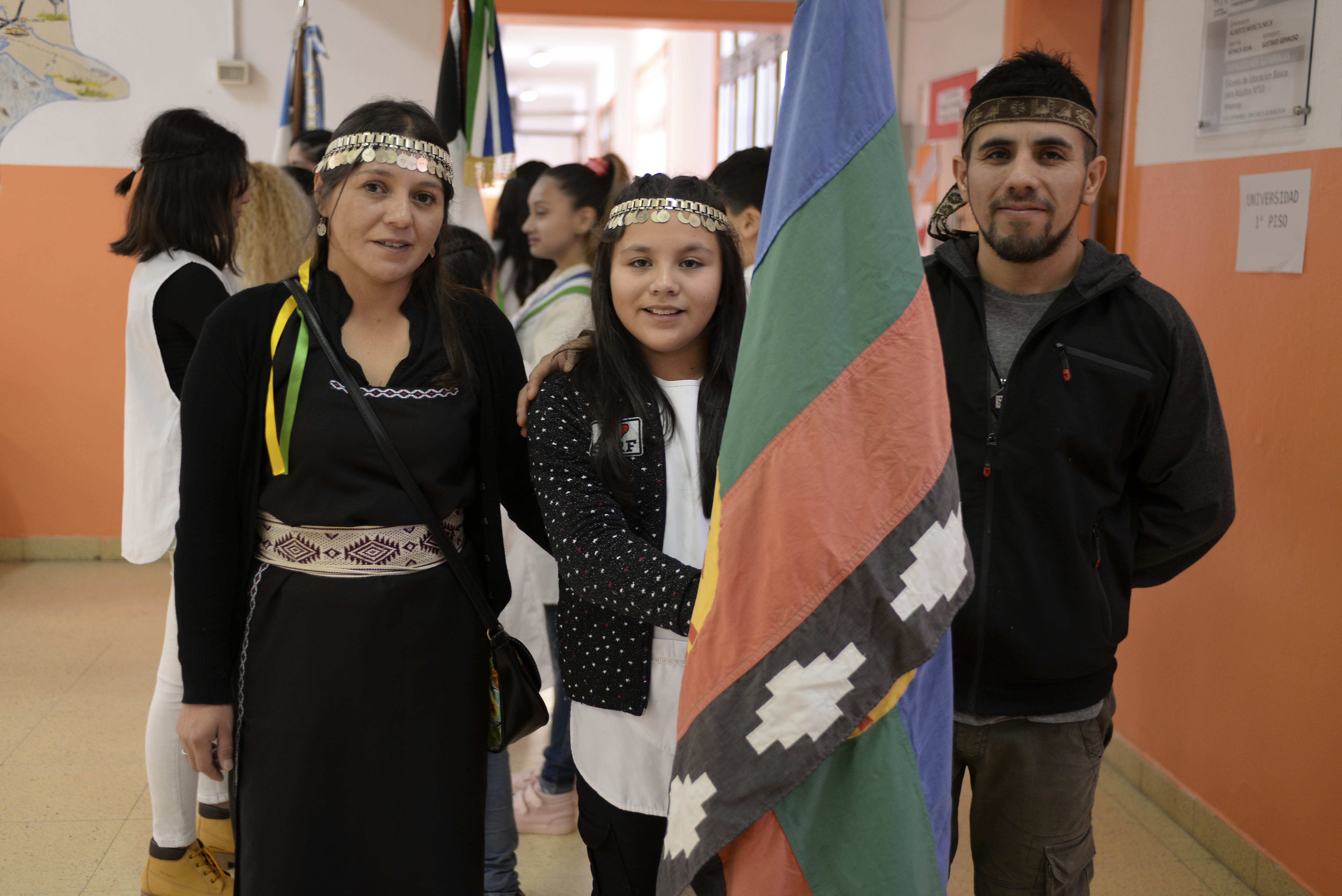 Mailén, hermana de uno de los niños, que también asiste a la escuela, portó la bandera mapuche, junto a Carolina, su madre, y el lonco de la comunidad Quintupuray, Lucas Quintupuray, en el acto de promesa de lealtad a la bandera.