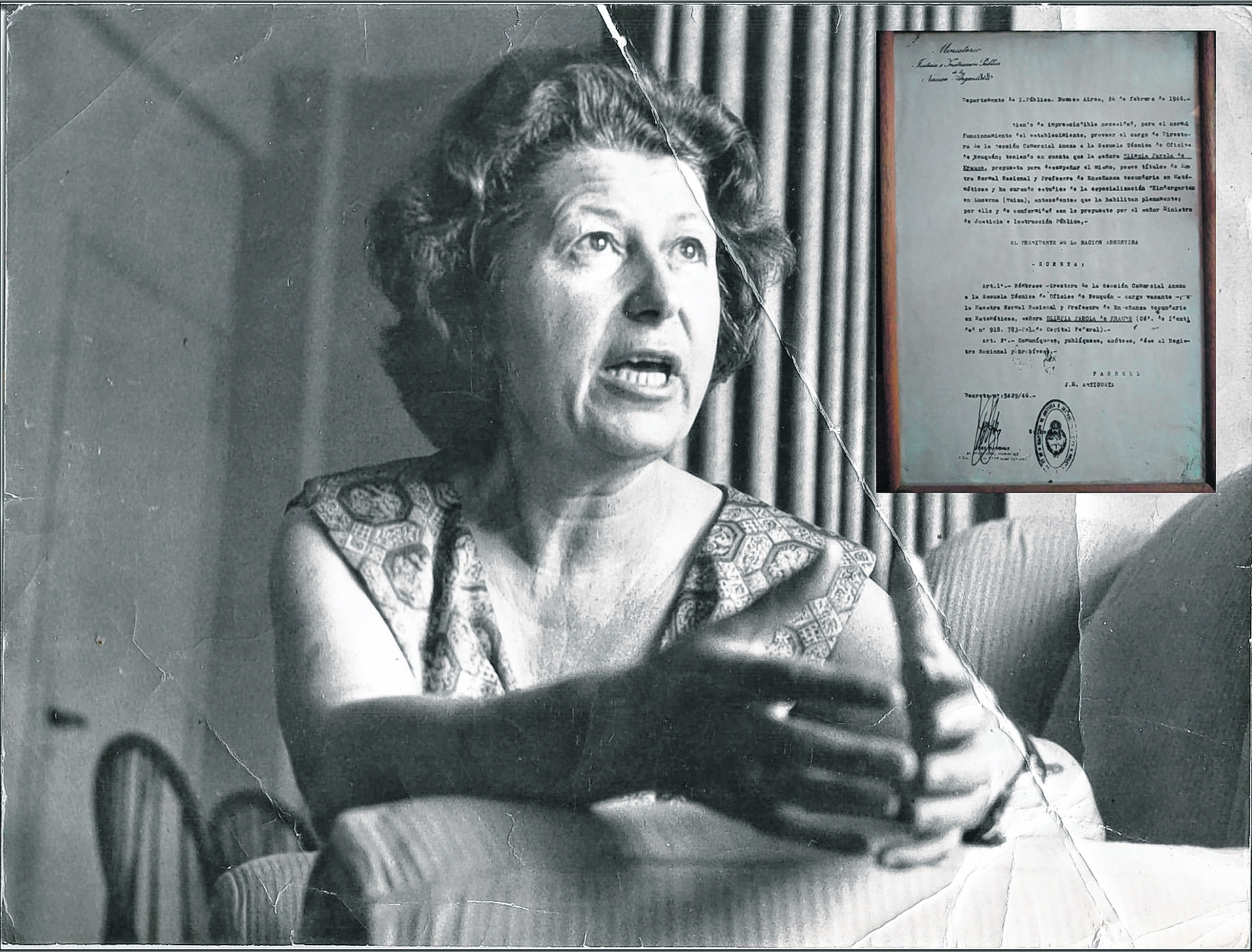 Pusieron en marcha las tareas para lograr tan trascendental hecho: un mismo decreto del año 1943 n° 143.794/43 creó las escuelas secundarias Nacionales de Neuquén, dependientes de la Escuela de Artes y Oficios de General Roca; Colegio San Martín; Enet 1 -hoy Epet 8-, Enet 2 -hoy Epet 14; entre otras. En la foto podemos apreciar a Olympia y el documento enviado por autoridades nacionales para la organización de las escuelas secundarias nacionales en esta región. La Profesora Parola en 1954 había dejado el Colegio San Martín para irse a vivir a Buenos Aires y allí ejerció en el Liceo Nacional de Señoritas Nº 9 de Belgrano, donde continuó con la tarea de enseñar.
