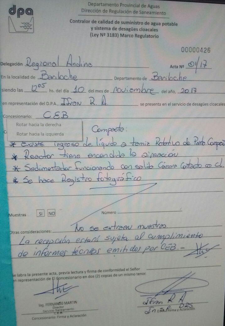 En ese momento (noviembre de 2017) se firmó un acta en la que consta el funcionamiento y que rubrica el ingeniero Fernando Martín como responsable del área de saneamiento de la CEB.
