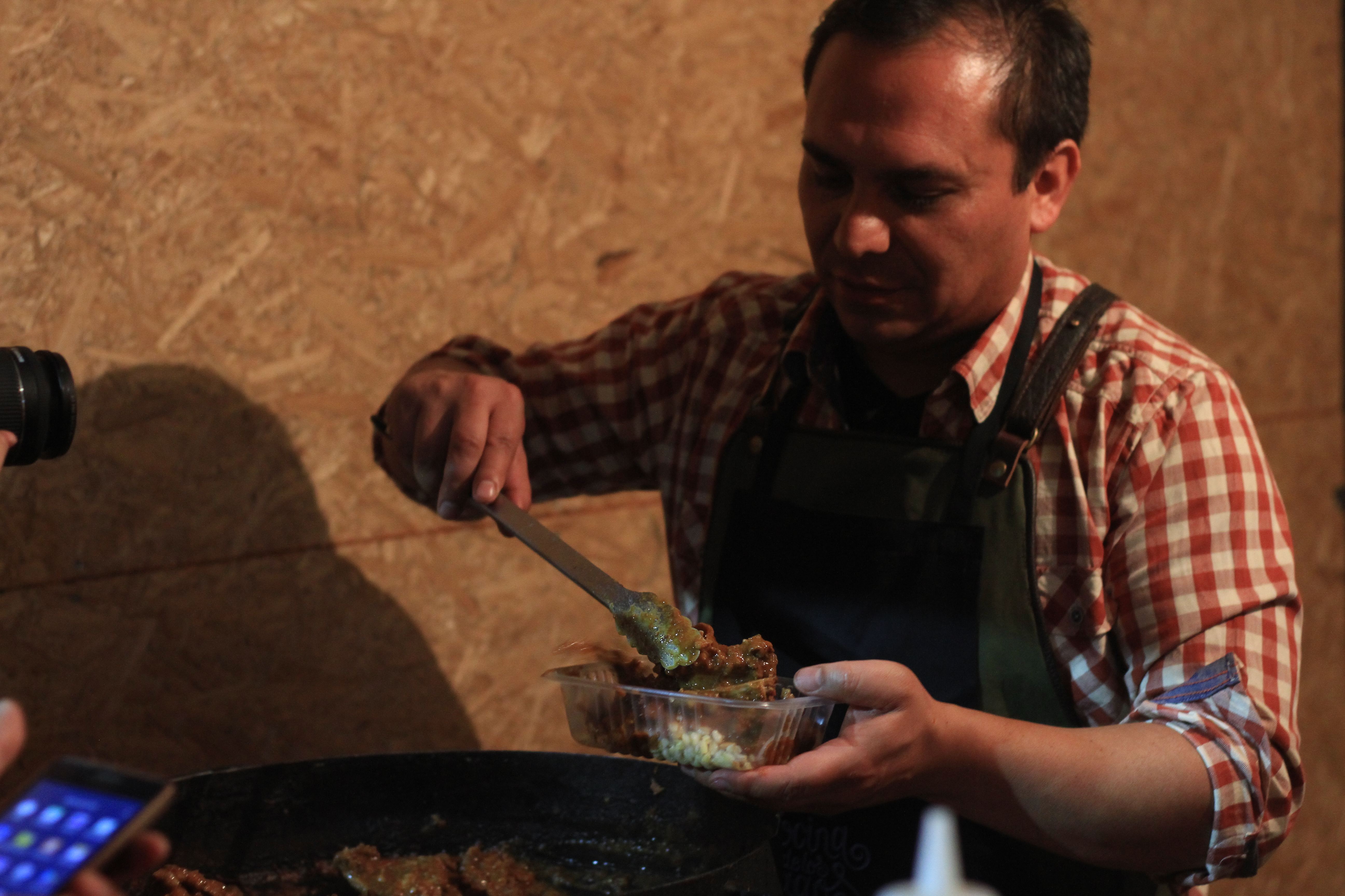 Rodrigo Gajardo vendiendo una porción de su guiso con carne de capón y cordero.