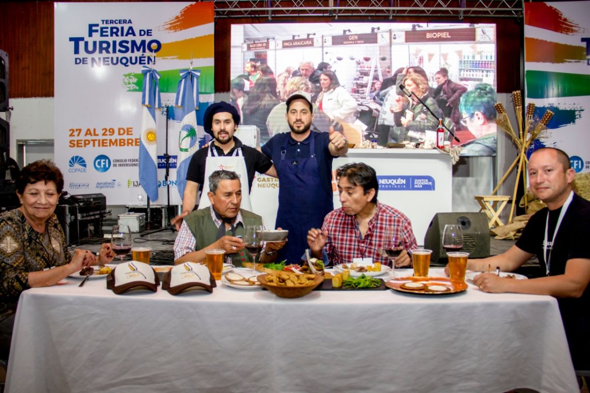 Focarazzo, funcionarios del Ministerio de Turismo, Natalia Manavella, Secretaria de Turismo y Planificación, Antonio Puel, en representación del Parque de Nieve Batea Mahuida de la Comunidad Mapuche Puel, la Directora de Turismo Marina Savarino, el Gerente de Eprotur, Leonardo Cánepa y operadores turísticos de la localidad acompañaron la presentación de cocina en vivo propuesta por Villa Pehuenia Moquehue de la mano del chef Alberto Puel, acompañado por Emmanuel Leiva en representación del Sello de Distinción de la Gastronomía neuquina.