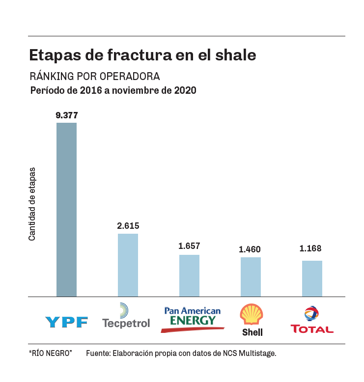 La cuarta posición se la quedó la angloholandesa Shell con 1.460 etapas de fractura y es una de las dos empresas que logró superar su récord personal en Vaca Muerta en el 2020. A noviembre alcanzó las 648 etapas y ya era su registro más alto desde que desembarcó en la formación.