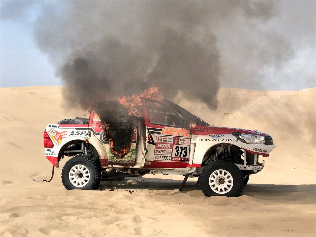 Destacó que “por lo que comentan los que lo vieron pasar, la camioneta perdía combustible”. Algo similar le tocó vivir en la edición 2013 del Dakar, que también largó en Perú, al rionegrino Pablo Busín, quien en la primera etapa vio como el fuego destruía su moto.