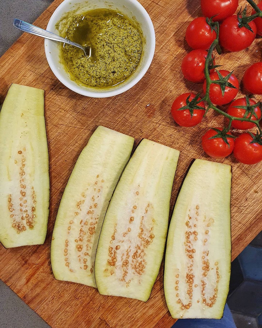 Armás con el pan que tengas/te guste, doradito, la feta de berenjena asada, tomatitos, pesto, sal, pimienta y listo, a disfrutar.