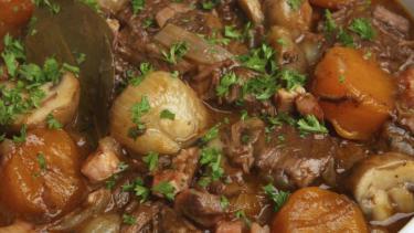 Ahora agregar la calabaza, las manzanas, las papas, las zanahorias y continuar la cocción del estofado durante 20 minutos o hasta que la calabaza y las manzanas estén tiernas. Hecho esto retirar de la estufa, quitar la hoja de laurel y servir.