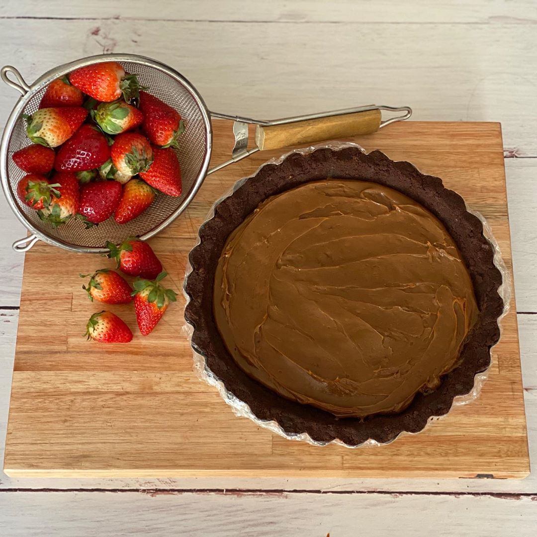 Llevar a la heladera o al freezer y dejar enfriar bien. En la base de la tarta colocar una capa de dulce de leche.