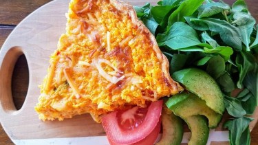 Mezclar bien y volcar sobre la base de tarta y llevar al horno, a 180° C, unos 25 minutos, hasta que la superficie esté firme.