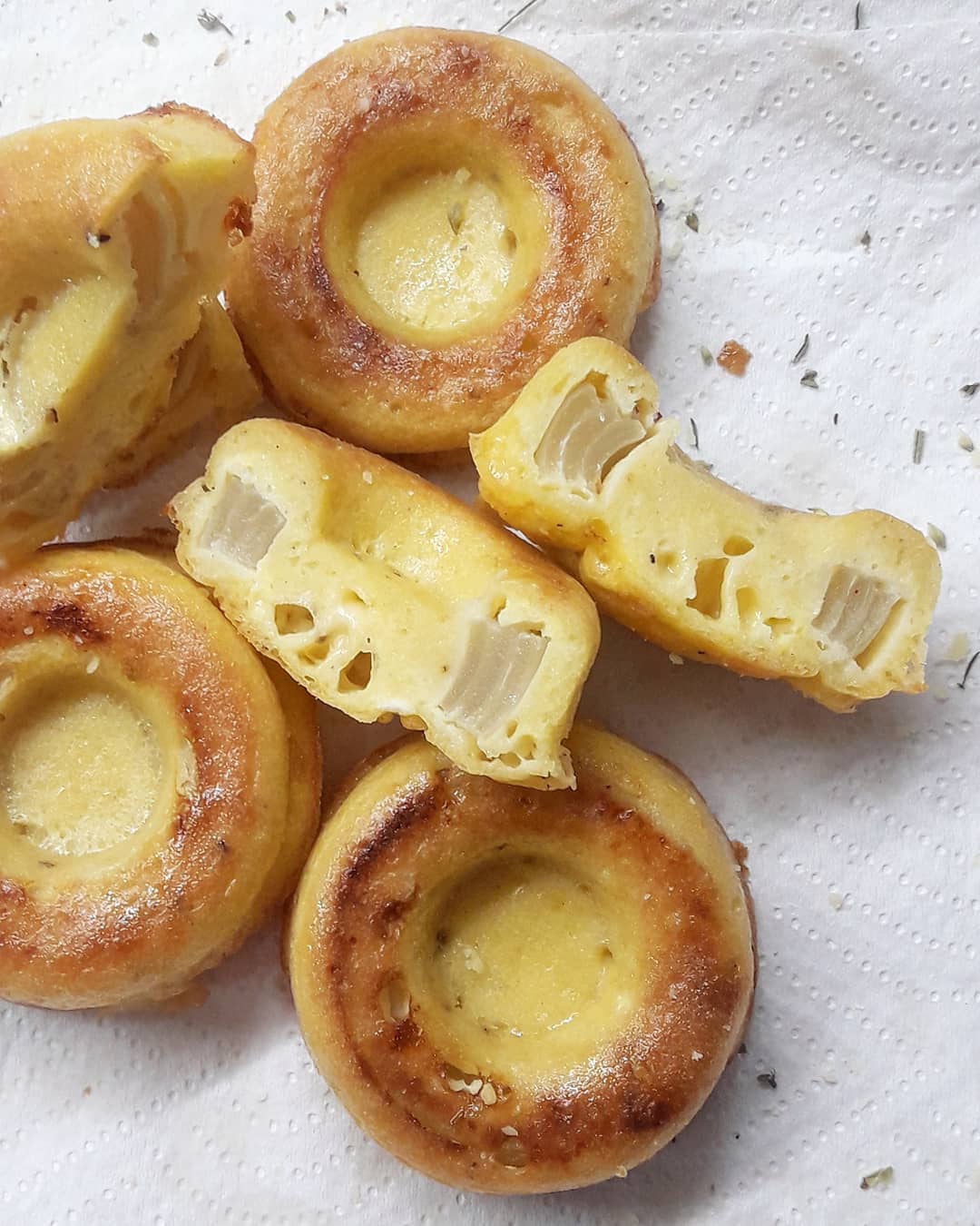 Batimos los huevos con los condimentos, el azúcar, el queso rallado y 1 cda de harina de arroz. Pasamos los aros de cebolla por harina de arroz. Luego por el huevo y los acomodamos en un molde (puede ser de muffins también). Los cubrimos con la muzzarella y finalizamos con el resto de la mezcla de huevos. Cocinamos en horno precalentado al máximo hasta verlos dorados y listo.
