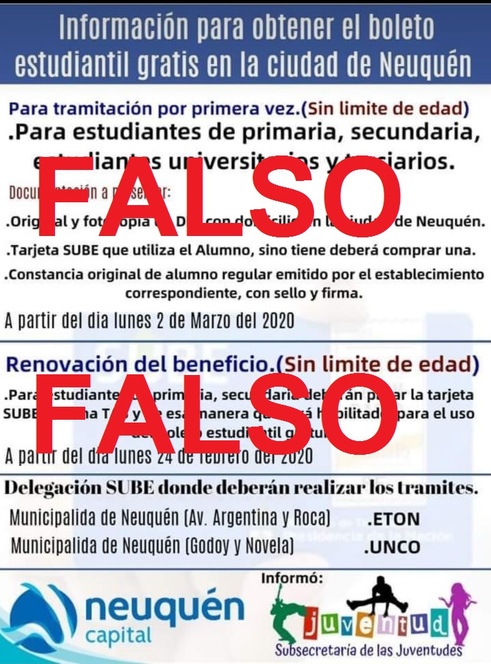 Una de las informaciones que más circuló fue la de un cartel en la que especifican los requisitos para el boleto estudiantil, pero aseguraron que era información falsa, que surgió de otras publicaciones que tampoco eran ciertas.